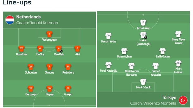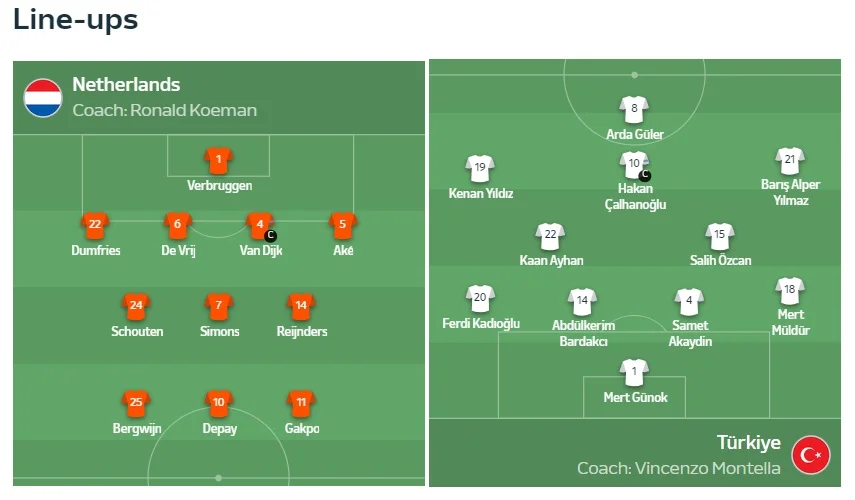 Нідерланди: Вербрюгген – Дюмфріс, Де Врей, ван Дейк, Аке – Схаутен, Рейндерс – Бергвейн, Сімонс, Гакпо – Депай