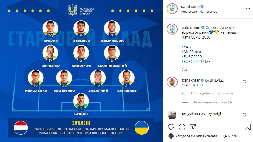 Запасні: Пятов, Трубін, Соболь, Кривцов, Степаненко, Шапаренко, Марлос, Макаренко, Бєсєдін, Тимчик, Попов, Довбик