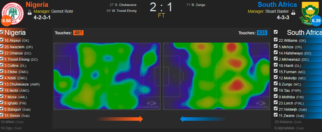 Втім, варто обережно відноситись до показників аналітичних порталів. "Суперорли" діяли від контратак і добивалися доволі високого рівня загострення ситуацій – так, з 11 ударів по воротах 7 пройшло з меж штрафного, а 4 з 6 обіграшів суперника на дриблінгу відбулися у ньому або перед ним. Нігерійці класно діяли від власних сильних сторін – швидкості, дриблінгу та індивідуального класу – і досить легко знайшли слабкі місця в системі організації гри збірної ПАР.
