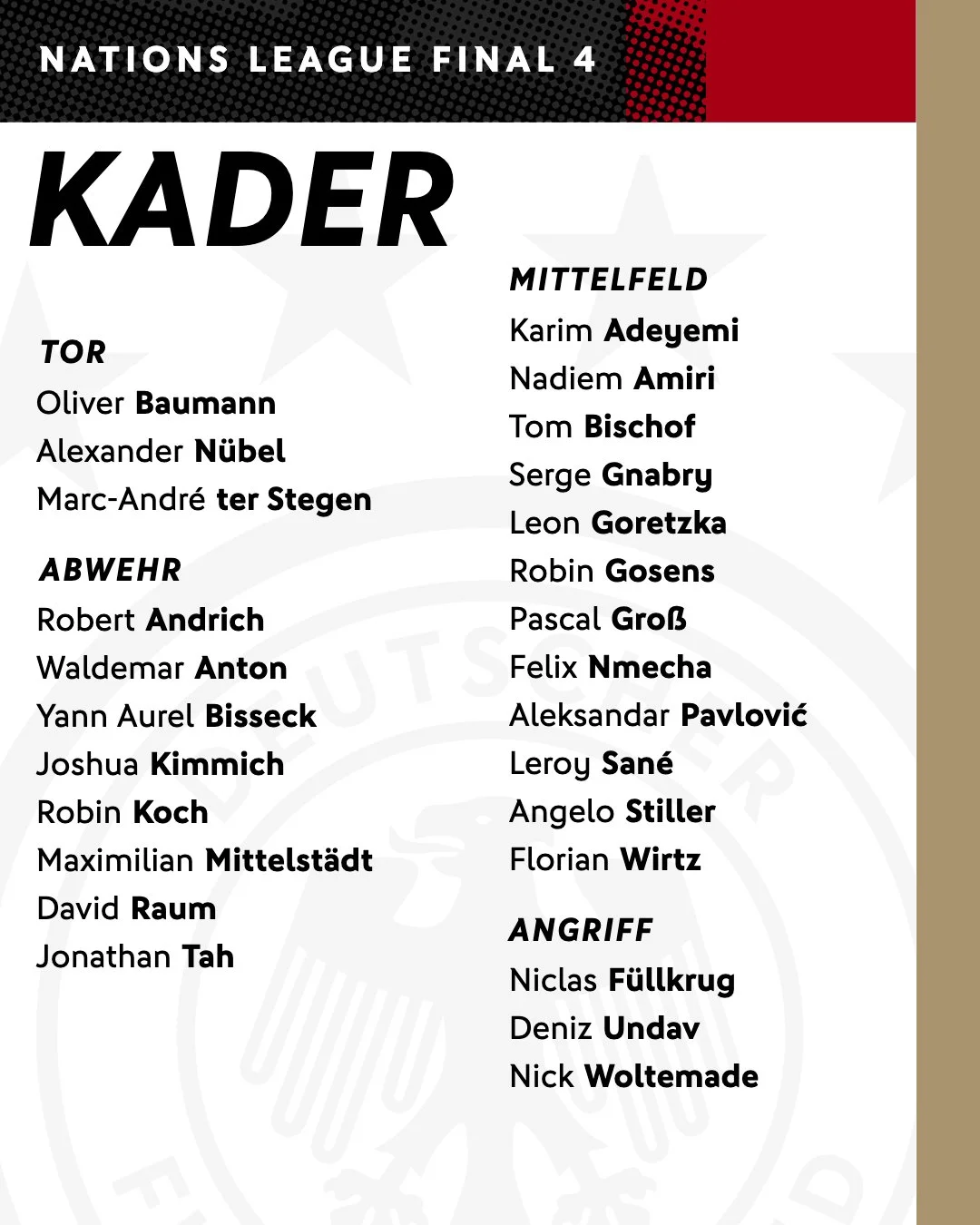 Склад "Бундестім" на тлі суперників виглядає ослабленим. Повз заявку пролетіли Мусіала, Рюдігер, Шлоттербек і Кляйндінст, однак вони відсутні через травми. Відзначити можна тільки відсутність Хаверца, а всі інші лідери останнього року потрапили у табір – зокрема, Вірц, Кімміх, Горецка, Сане, тер Штеген, Та, Раум, Міттельштадт, Антон і Штіллер (потенційний новачок Реала).
