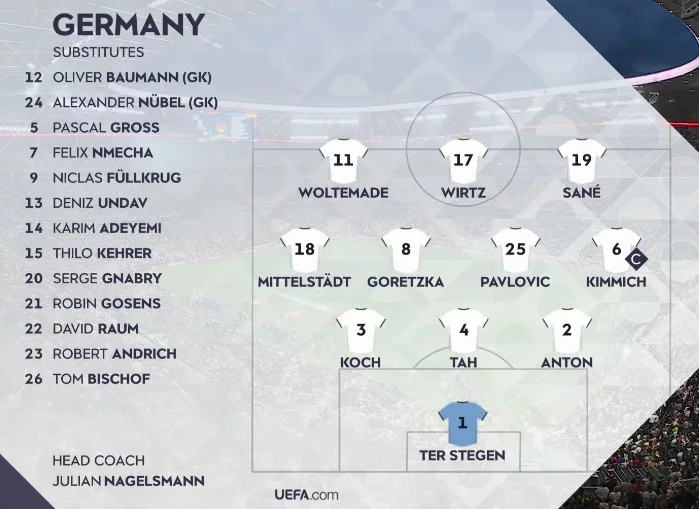 Повз заявку німців пролетіли травмовані Рюдігер, Мусіала, Шлоттербек і Кляйндінст, а Хаверца з Брандтом не викликали. Зате залишились Вірц, Кімміх, Горецка, й Сане, та і запас був хорошим. Найцікавішим ходом Юліана Нагельсманна став вихід Вольтемаде на вістрі атаки.