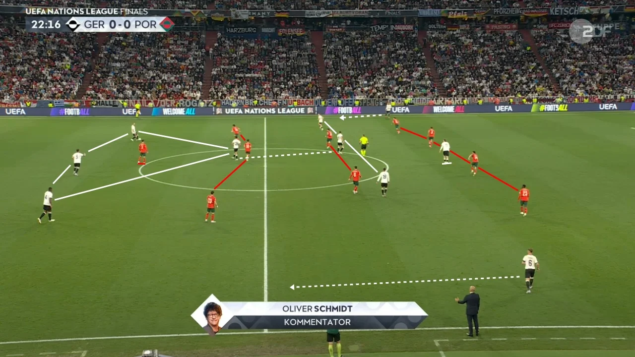 Португалія дещо здивувала високим пресингом на перших хвилинах. Він навіть працював, однак досить швидко Німеччина адаптувалась – давалась взнаки пасивність Роналду. Команда Роберто Мартінеса змушена була зустрічати суперника в середньому блоці. Позиційного наступу майже не існувало, а замість цього піренейці намагались тікати у флангові контратаки.