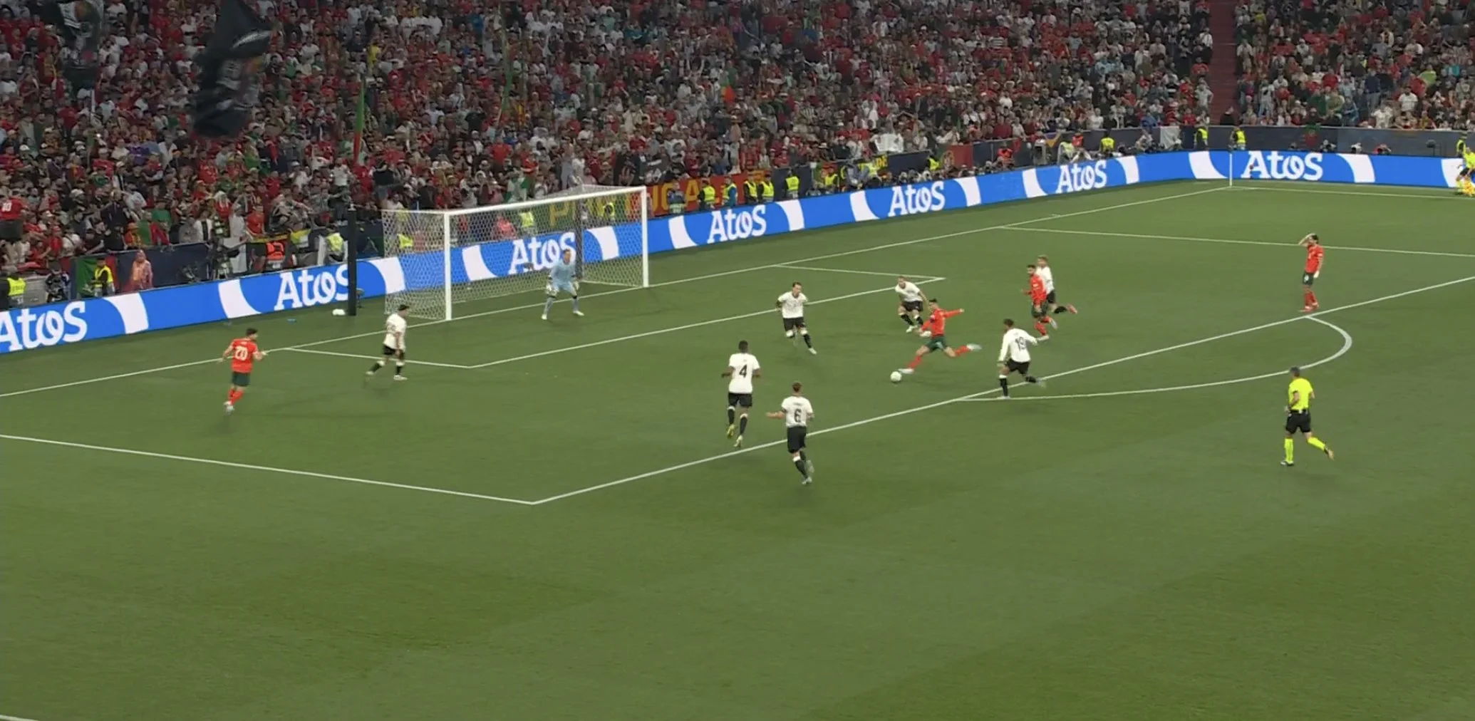 А вже на 68-й Португалія вирвалась уперед Нуну Мендеш знову прорвався правим флангом і прострілив вздовж воротарського, а Роналду замкнув – 1:2! У цій атаці велику роль зіграла динаміка просувань Вітіньї, яка передувала завершальній фазі.