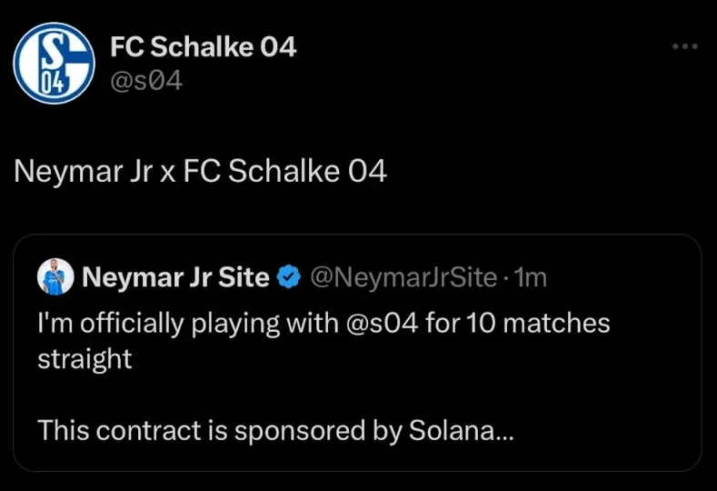 "Я офіційно гратиму за Шальке в наступних десяти матчах. Спонсором контракту є Solana". Таке повідомлення з'явилося в неофіційному акаунті Неймара в Твіттері. Однак офіційний сайт Шальке зробив репост цього коментаря і тим самим звів його в офіційний статус.