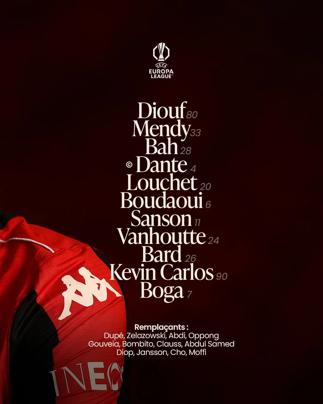 Стартовий склад Ніцци: Діуф – Менді, Ба, Данте (к) – Луше, Будауї, Сансон, Ванхаутт, Бард – Кевін Карлос, Бога.