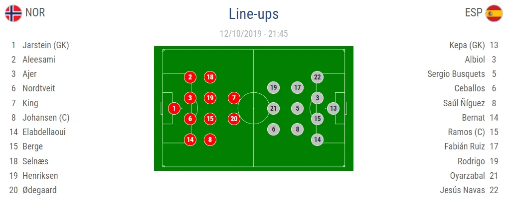 Матч 7-го туру кваліфікації до Євро-2020 Норвегія – Іспанія розпочався о 21:45 за київським часом і завершився результативною нічиєю – 1:1. Обидва голи були забиті в другому таймі: на 47-й хвилині дальнім пострілом в лівий нижній кут відзначився Сауль Ньїгес, а на 90+4-й з пенальті рахунок зрівняв Джошуа Кінг.