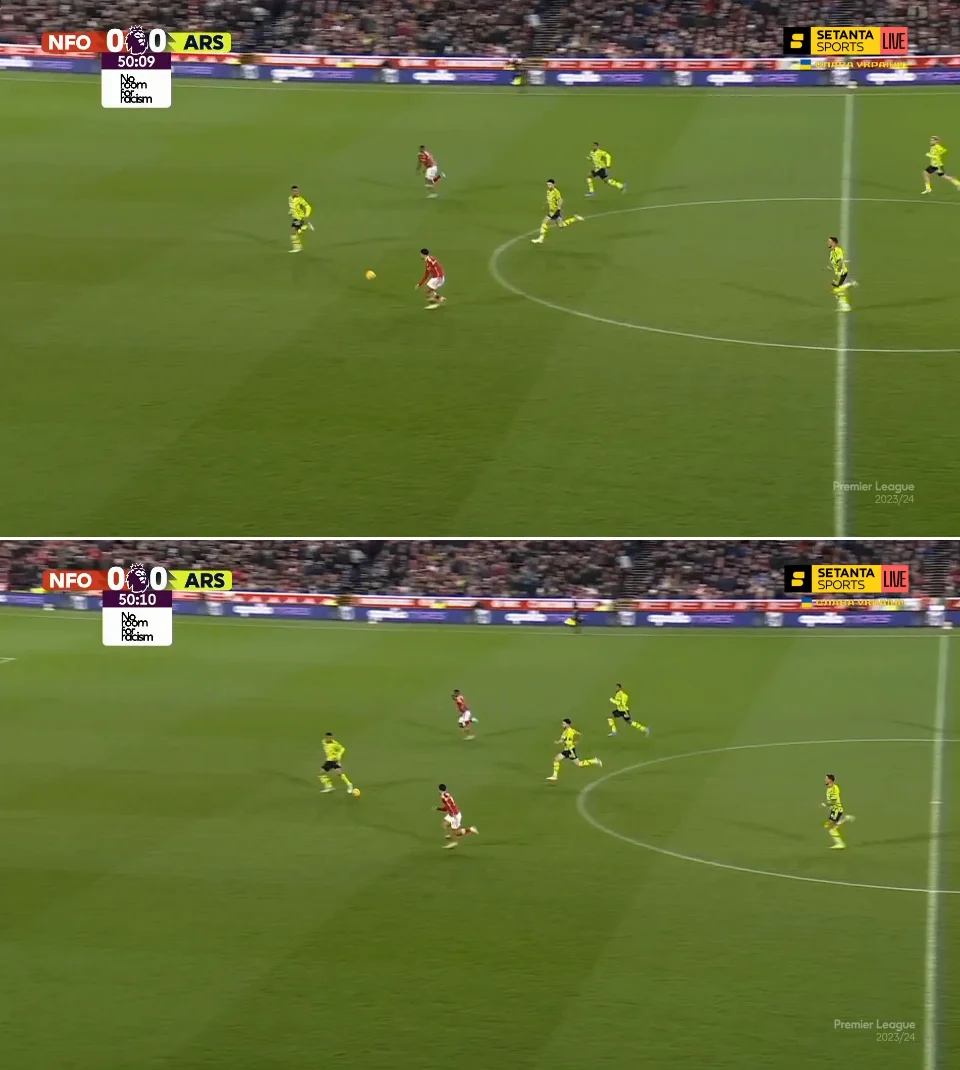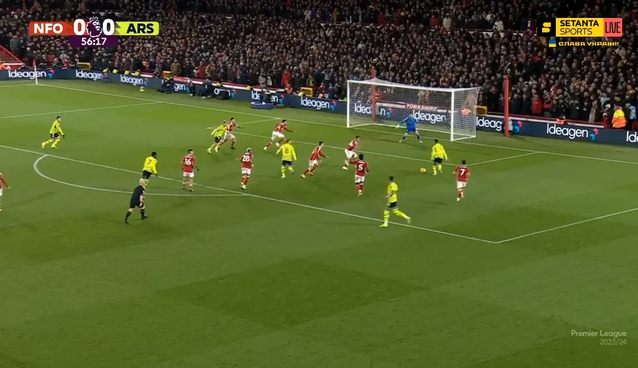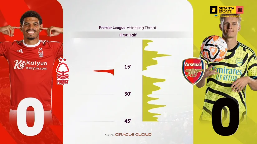 Тренер Ноттінгема – Нуну Ешпіріту Санту – не став вигадувати під Арсенал щось особливе. Як це часто буває у матчах його команд проти топів АПЛ, "лісники" сіли у компактний низький блок, взагалі відмовившись від м'яча. Показник володіння у першому таймі склав 19%, а на окремих 10-хвилинках він опускався до 5%.