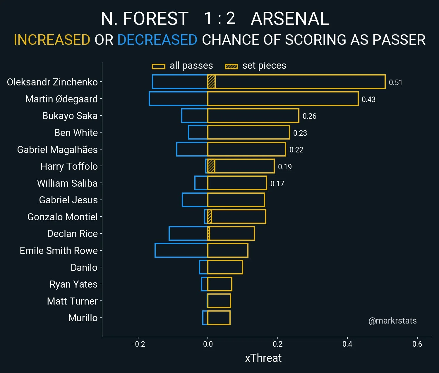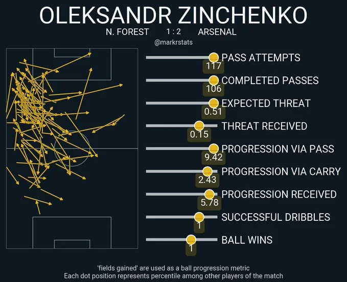 Загалом, матч у Ноттінгемі продемонстрував, чому Зінченко грає в основі Арсенала, попри свої проблеми з обороною. Лондонці тримали володіння на рівні 74%, понад 80% часу провисіли на чужій половині й зривали більшість контратак хорошим контрпресингом. У такому малюнку гри Сашко приносить колосальну користь – зиск від його дій значно вищий, ніж шкода від роботі в захисті.