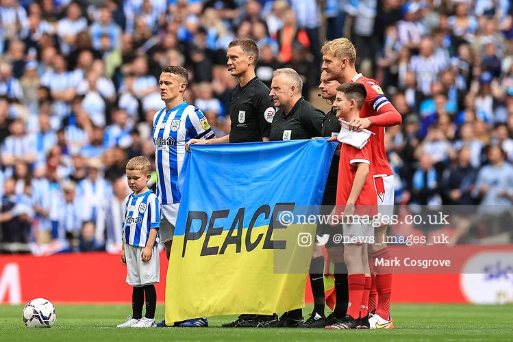 Перед початком зустрічі капітани команд сфотографувалися з прапором України та закликом до миру. Перший тайм на Вемблі вийшов відверто нудним. Команди надто боялися помилитися в матчі, який гарантує щонайменше 135 млн фунтів. Все котилося до логічних нулів, аж поки вихованець МЮ Джеймс Гарнер не наважився на дальній удар з 26-27 метрів. 19-річний захисник Леві Колвілл намагався перервати постріл, але зрізав м'яч точінісінько у дев'ятку власних воріт. Ноттінгем отримав таку потрібну перевагу перед відпочинком.