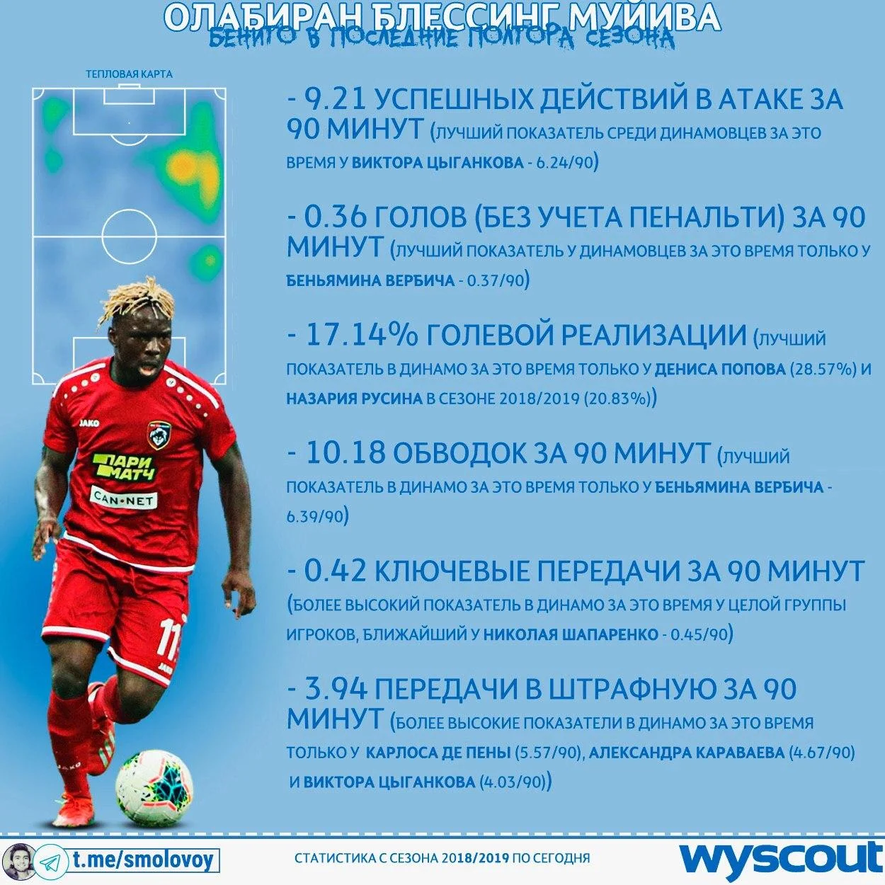 Відомий блогер Михайло Смоловой, озброївшись даними Wyscout, оперативно порівняв показники Беніто в Тамбові з цифрами атакувальних гравців Динамо. Загалом, нігерієць провів на полі дуже мало часу, щоб робити якісь глобальні висновки, але картина виглядає перспективно.