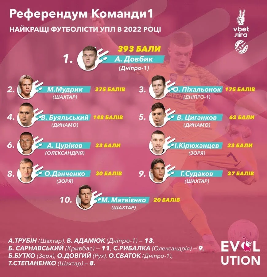 Другим фінішував вінгер Шахтаря Михайло Мудрик, який поступився Довбику всього на 18 балів. Третім став хавбек "спортклубівців" Олександр Піхальонок (175 балів). Далі перша десятка виглядає так: