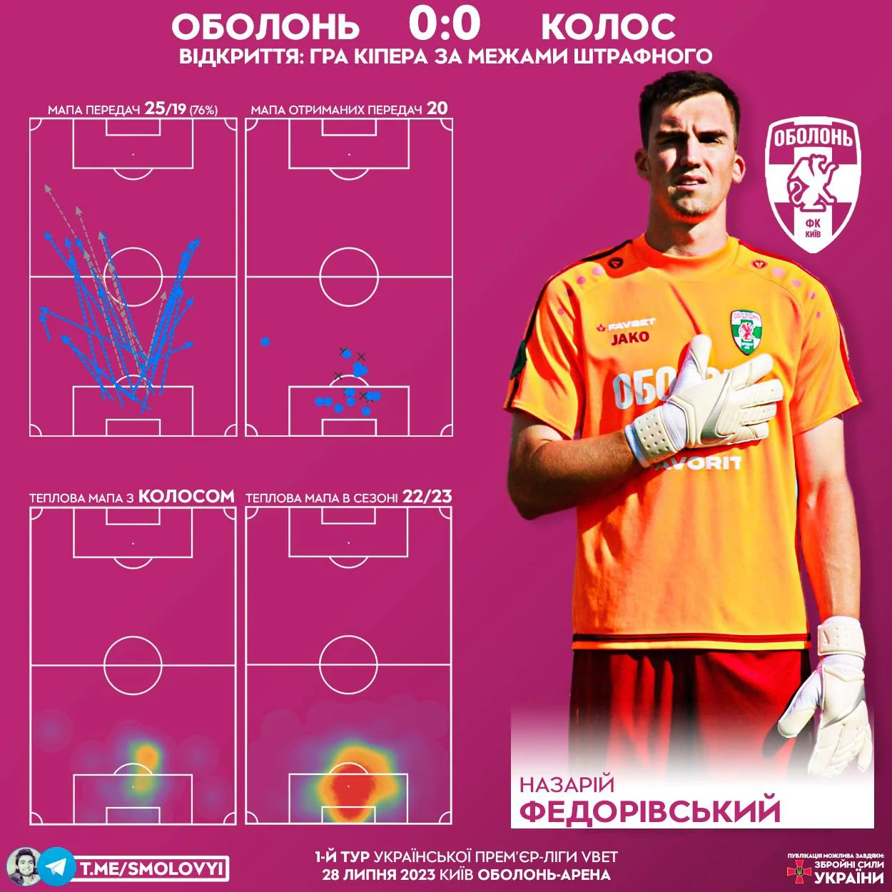 Такий простенький футбол не дивує, адже Оболонь зайшла в УПЛ з першоліговим складом, майже не посилившись за літо. Тим не менш, команда дисциплінована й добре підготовлена для місива в низах таблиці. Приємною несподіванкою стала шикарна гра ногами у виконанні кіпера Федорівського – із 25-ти його передач в матчі з Колосом одразу 14 йшло з просуванням, що є воротарським рекордом туру. Точність пасів з просуванням досягла 85.71%, частина з них виконана з-за меж штрафного.