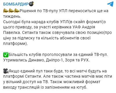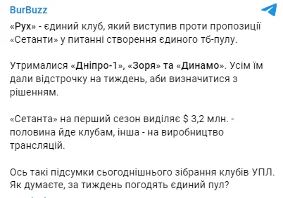 Зокрема, одразу четверо клубів відмовились голосувати за єдиний ТВ-пул, який пропонувала Setanta Sports. За інформацією Telegram-каналу BurBuzz, проти виступив Рух, а Динамо, СК Дніпро-1 та Зоря утримались. Усім їм дали тиждень, аби визначитися з рішенням.