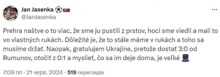 Відомий журналіст Ян Ясенка засмучений не лише поразкою рідної збірної, але й реакцією словацьких фанів, які начебто накинулися на Україну. "Поразка ще більше болить, адже ми самі випустили це з власних рук. Важливо, що ми досі залежимо від себе. Потрібно за це триматися. Я вітаю Україну, адже отримати 3:0 від Румунії і відігратися з 0:1, попри те, що відбувається у них вдома, заслуговує поваги.