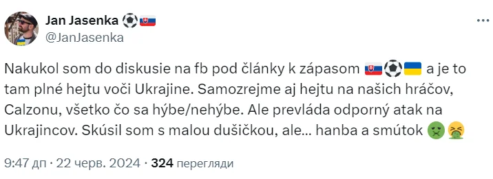 Зазирнув в обговорення у Фейсбуці під статтями про матч, і воно сповнене ненависті до України. Звісно, є хейт щодо наших гравців, Кальцони, усього, що рухається і не рухається. Але переважає огидна атака на українців. Я намагався з душею, але... сором і смуток".