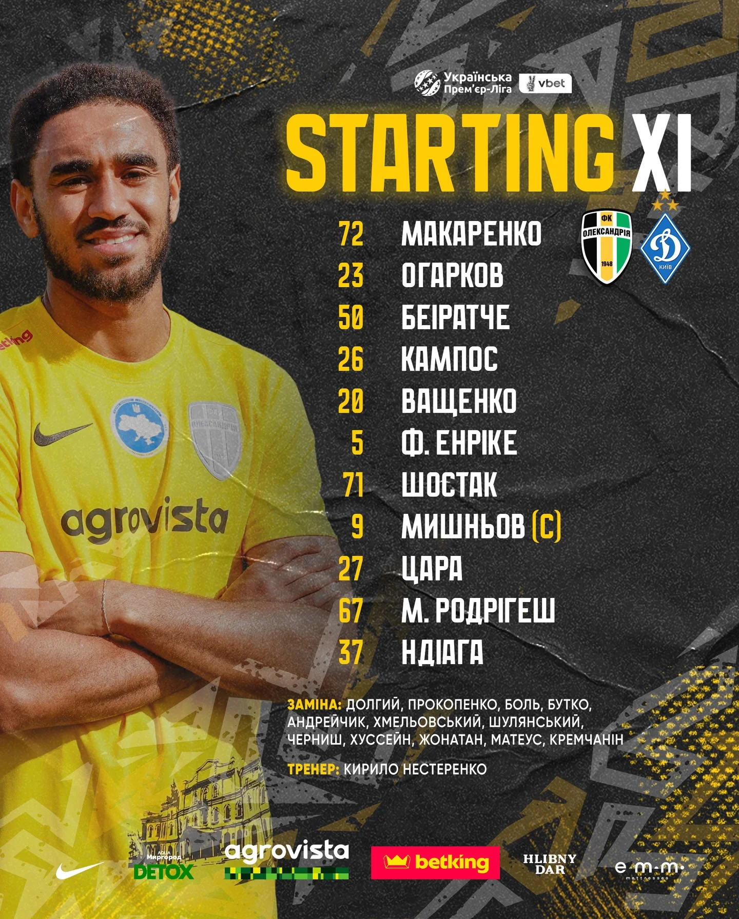 Олександрія: Макаренко – Ващенко, Кампуш, Беіратче, Огарков – Фернандо Енріке – Мауро Родрігеш, Шостак, Мишньов (к), Цара – Яде.