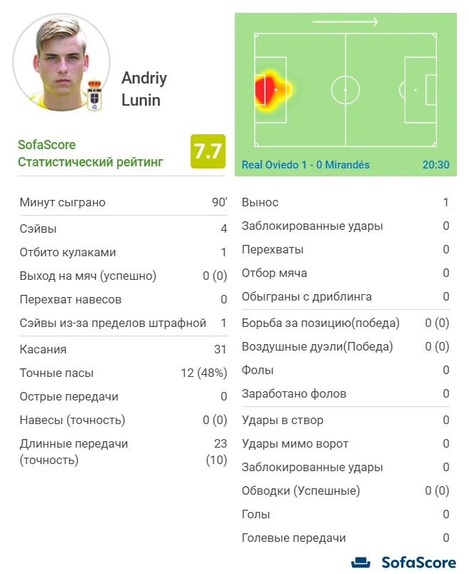 Зрештою, в активі Луніна у матчі з Мірандесом 4 сейви. Портал Sofa Score назвав голкіпера збірної України найкращим гравцем поєдинку, в якому наш футболіст оформив міні-ювілей – 5-й поєдинок без пропущений голів у футболці Ов'єдо.