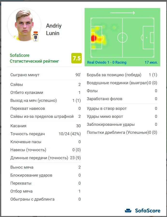 Статистика не враховує помилки, які відбулися після порушень правил. Саме тому Андрій Лунін зумів стати найкращим гравцем матчу за оцінками Sofa score. Українець отримав найвищий бал на дві команди – 7.5. Голкіпер Ов'єдо здійснив два сейви, 30 разів доторкнувся до м'яча, віддав 10 точних пасів (ще 12 – неточних). На перший погляд, цифри не вражають. Але потрібно розуміти спицифіку гри "карбайонес". Команда Хосе Зіганди – майстер "засушити" гру, а тут ще й вдалося забити швидкий гол. Відтак, на полі справді відбувалося доволі мало цікавого, а от роль голкіпера, який відстояв перемогу для своєї команди, варта уваги. Так, Луніну сьогодні не довелося робити карколомні сейви, але коли впевнено дієш на підстраховці і читаєш епізоди, то це й не потрібно. Зрештою, Ов'єдо підписував українського голкіпера, щоб не вилетіти з Сегунди. Завдання виконане, далі – повернення в Реал.