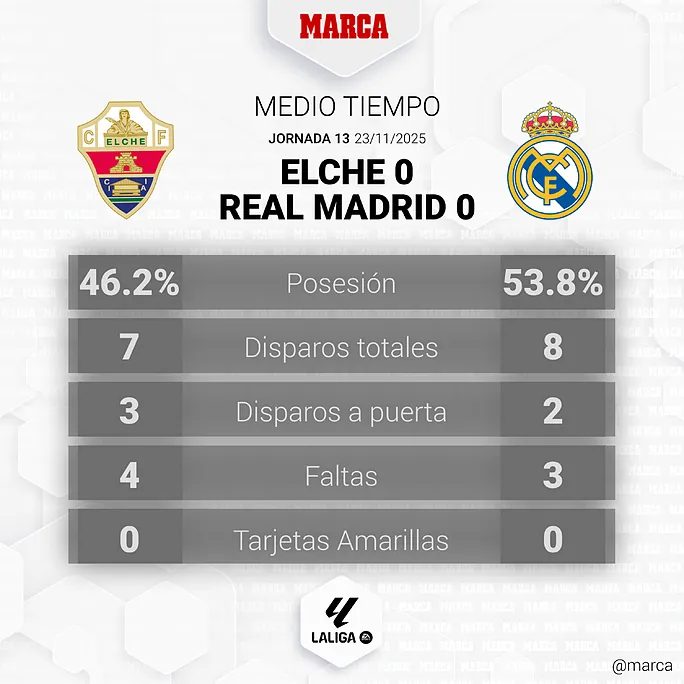 Реал на виїзді грав з Ельче. У першому таймі "вершкові" мали декілька нагод, щоб забити. Утім, Мбаппе ніяк не міг пробити Пенью. Ельче свої моменти теж створювало і, навіть, були ближчими до гола, аніж їхній іменитий суперник. Тібо Куртуа довелося демонструвати свою майстерність. У першому таймі абсолютно не відчувалося, що Ельче поступається в класі Реалу. Господарі огризалися і не тремтіли перед суперником.