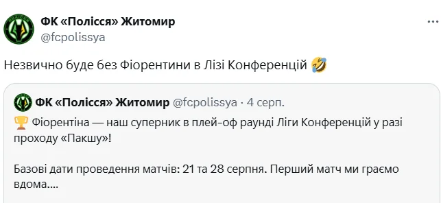 Але поки що маємо 3:0 після першого матчу з Пакшем і майже гарантований вихід у плей-офф Ліги конференцій. Там на "вовків" чекає Фіорентина. Як мінімум, житомиряни отримають досвід матчу проти справжнього топа, як максимум – створить мегасенсацію. Саме її пророчить твіттер Полісся.