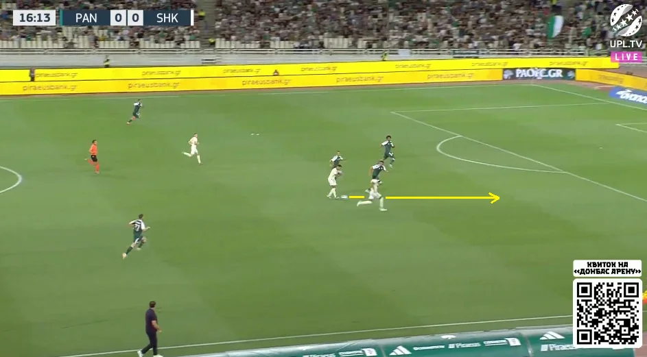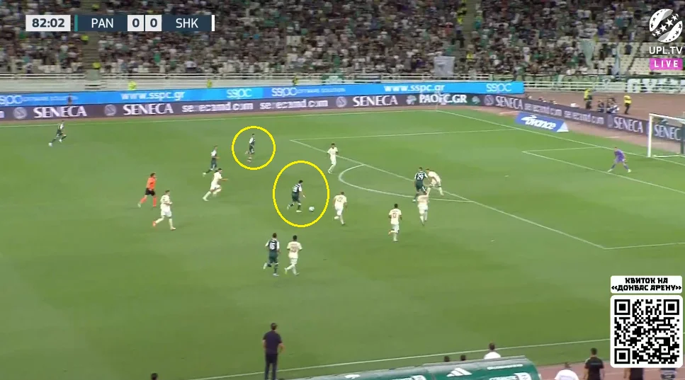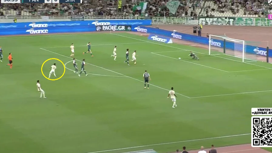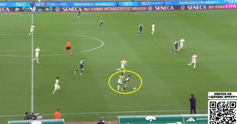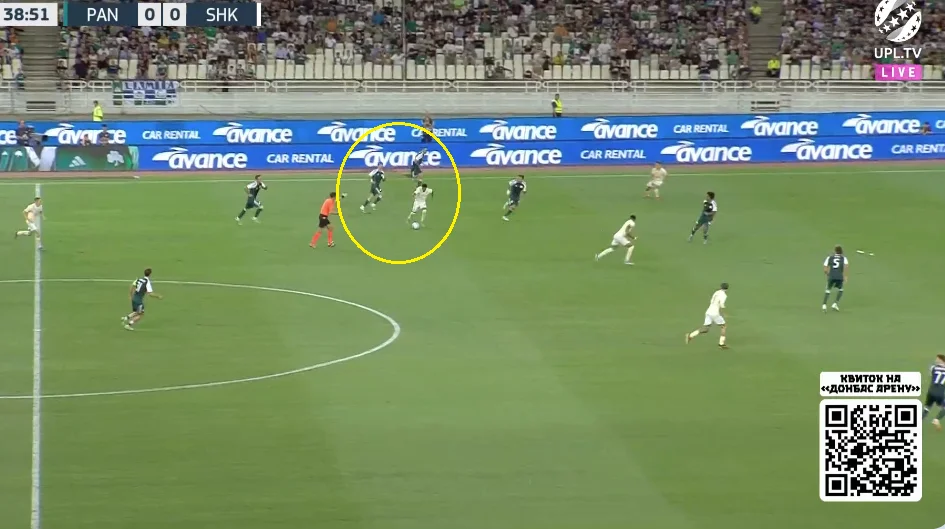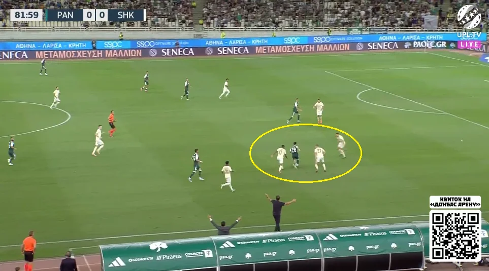 Підопічні Руя Віторії якісно підлаштували свої чесноти під стиль Шахтаря. Без м'яча греки зосереджувались на контролі глибини, демонструючи хорошу готовність до ривків десяток і вінгерів за спини. Захисники діяли злагоджено, правильно ставили корпус і не програвали у швидкості. Розривів у задній лінії практично не виникало.
