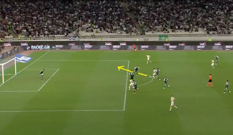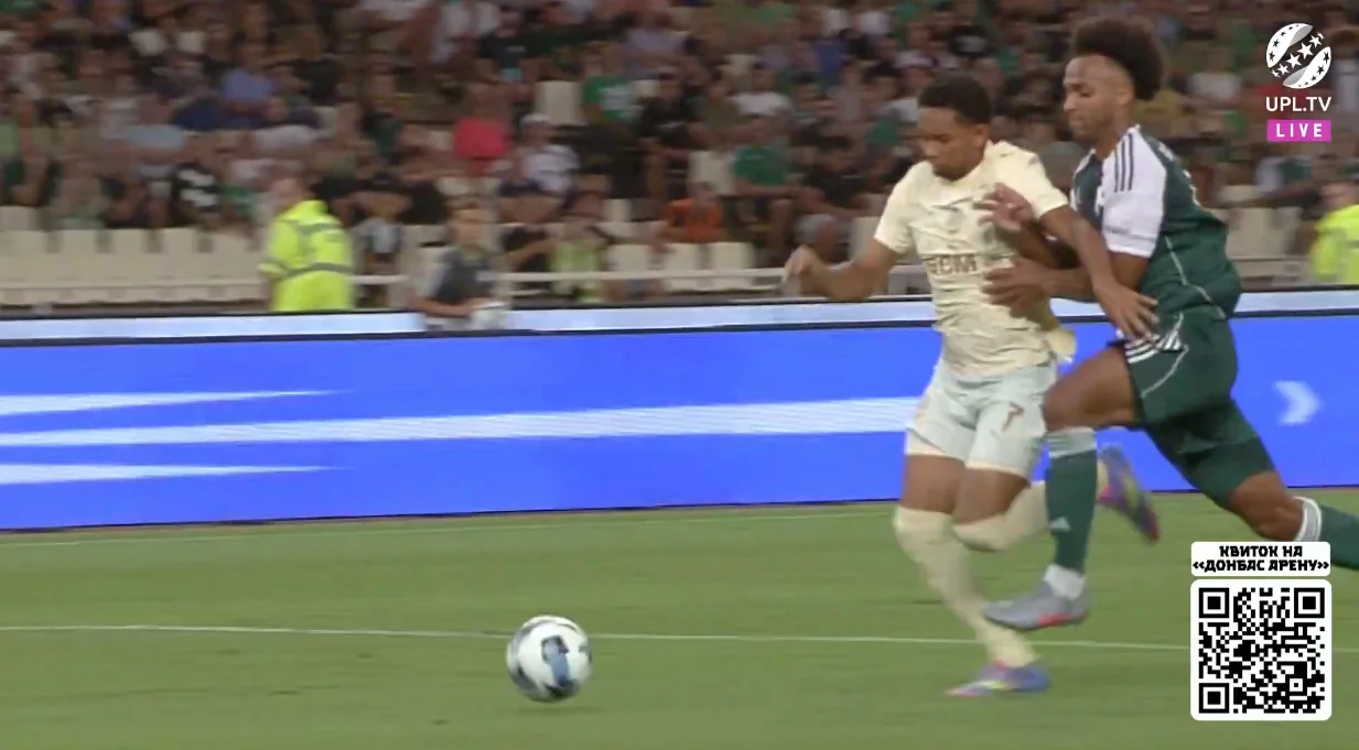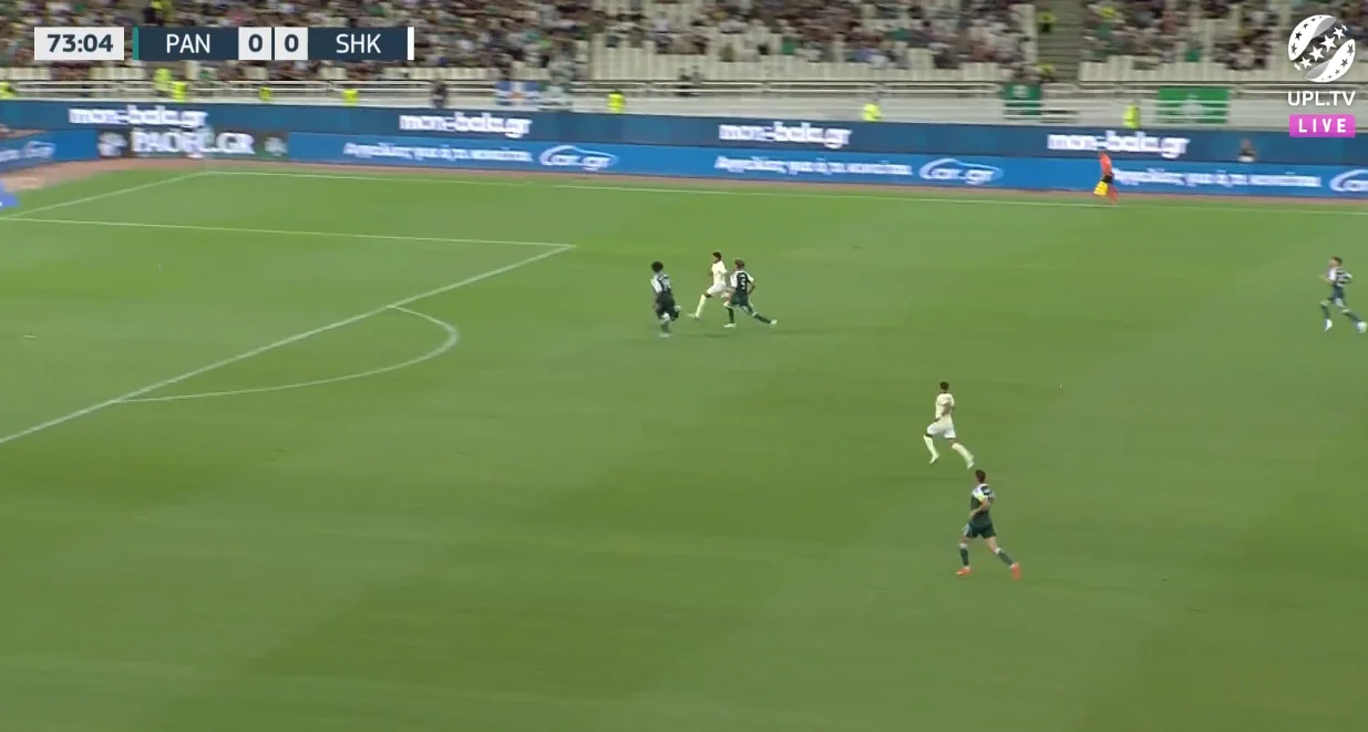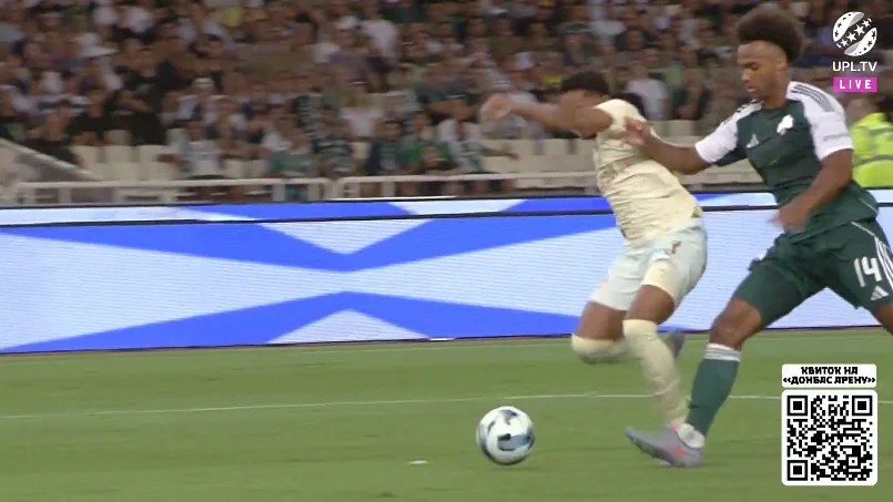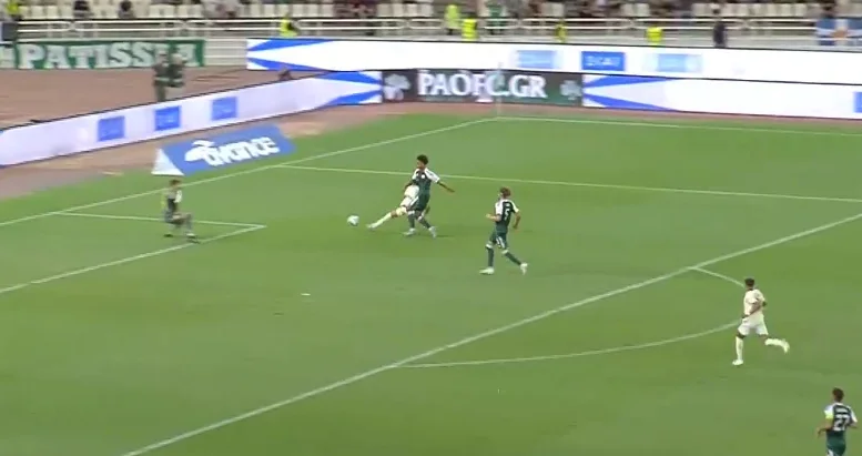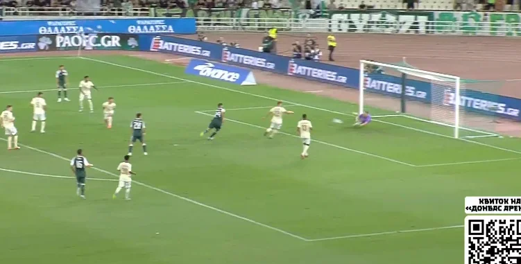 Справді страшний момент афіняни організували на 45-й хвилині після кутового. Марлон вибив м'яч на кут штрафного, де без опіки опинився Пеллістрі – екс-вінгер МЮ одразу ж показав клас, вгативши з лету в ближню дев'ятку. Різник виконав фантастичний сейв.