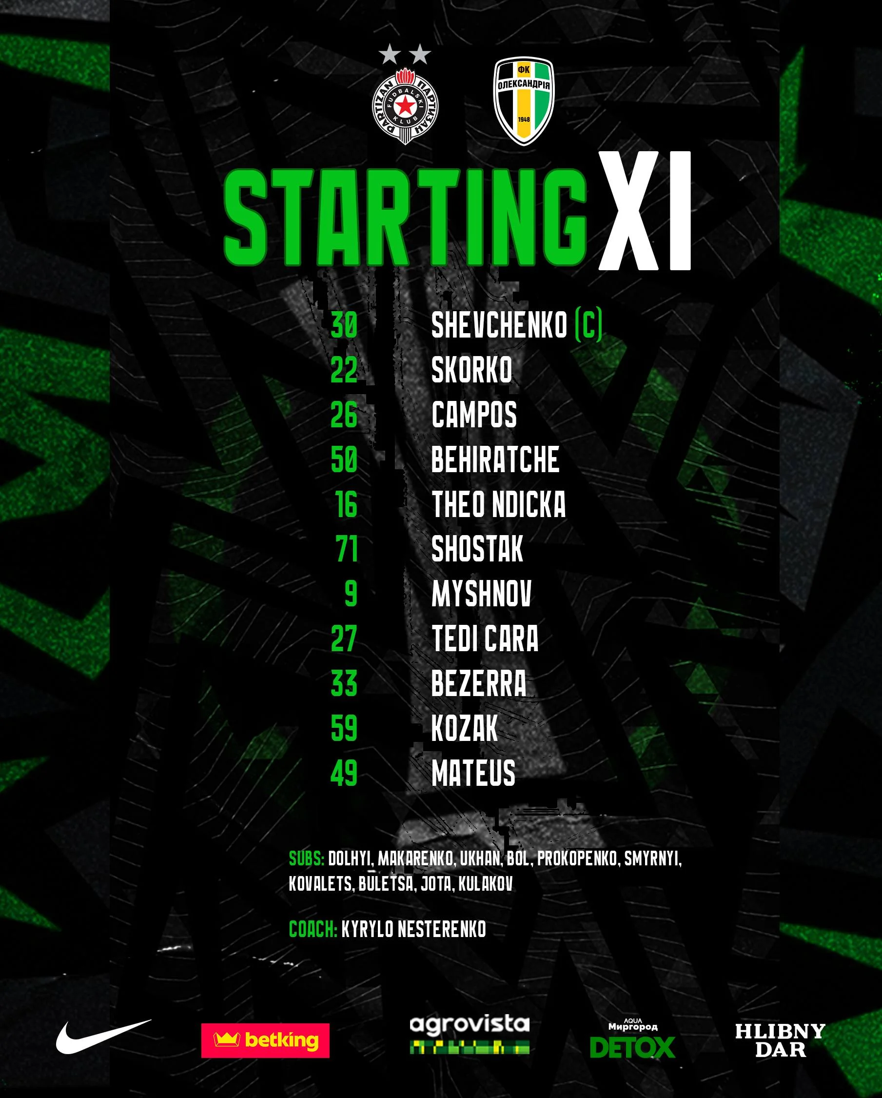 Стартові склади на матч Партизан – Олександрія