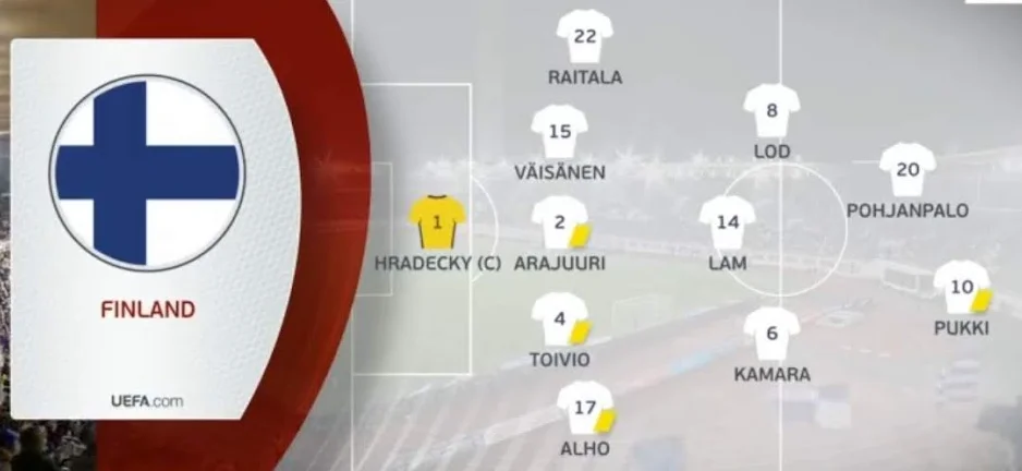 Фінляндія: Градецкі – Алхо (Хямяляйнен, 62), Тойвіо, Араюурі, Вяйсянен, Райтала (Нісканен, 77) – Лод, Лам (Ніссіля, 62), Камара – Пуккі, Пох'янпало (Ріскі, 77).