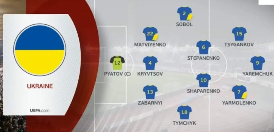 Україна: Пятов – Забарний, Кривцов, Матвієнко – Тимчик, Степаненко (Сидорчук, 77), Шапаренко, Соболь (Корнієнко, 46) – Ярмоленко (Булеца, 86), Циганков (Зубков, 77) – Яремчук (Довбик, 86).