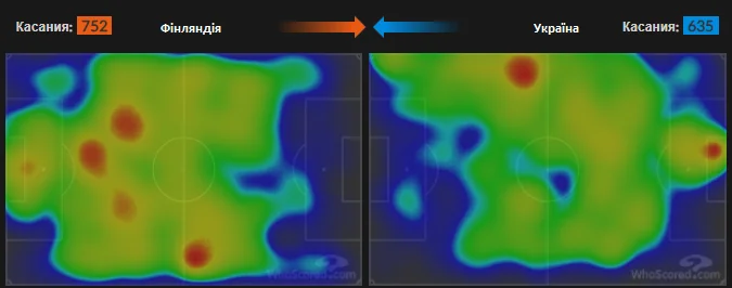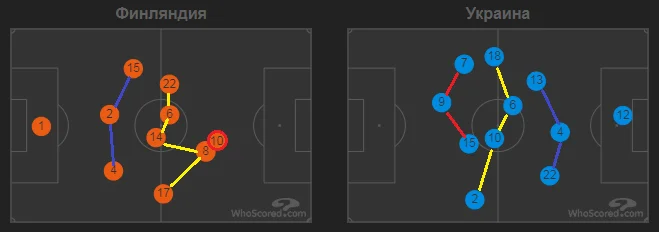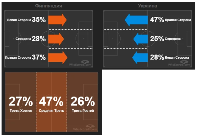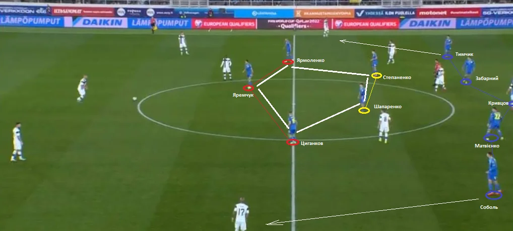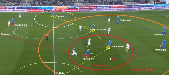 Щодо вертикальних зон, наша команда досить відчутно завалювалася на правий бік. Практично половина від усіх активних дій була створена саме на правому фланзі, де ефективно працювали Ярмоленко, Тимчик та Яремчук. Андрій вкотре підтвердив свій статус лідера команди. Крім великого об'єму роботи, Ярмоленко завдяки індивідуальній майстерності зробив перший гол. Фіни явно не очікували, що легіонер Вест Хема здатен так технічно покласти м'яч у кут воріт своєю неробочою ногою.