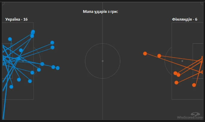 Перевага збірної України чудово помітна на мапі ударів по воротах з гри. Господарі в основному створювали небезпеку після стандартів. Саме після кутового команда Канерви забила гол. Також найнебезпечніший момент у другому таймі було створено господарями після подачі зі штрафного – Араюурі на добиванні з кількох метрів не влучив у площину воріт.