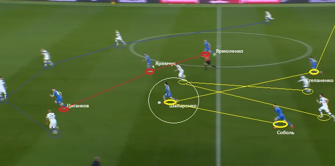 Агресивний тиск господарів поля оголював зони між їхніми групами атаки і захисту. На скріншоті вище помітно, що у подібних ситуаціях, як правило, вільними залишалися наші флангові гравці (у білих зонах). У такому випадку ефективніше було розбивати пресинг середніми та довгими передачами на Соболя і Тимчика.