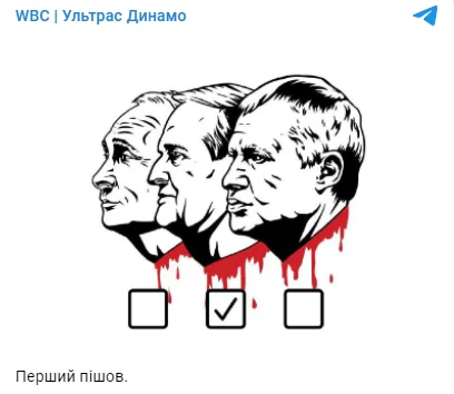 Ультрас виклали на своїй сторінці у соціальній мережі Telegram постер, на якому, крім Медведчука, також зображені президент Росії Володимир Путін і член партії ОПЗЖ та екс-президент Динамо Григорій Суркіс. "Перший пішов", – підписали світлину вболівальники, натякаючи, що ніхто не втече від відповідальності за свої злочини.