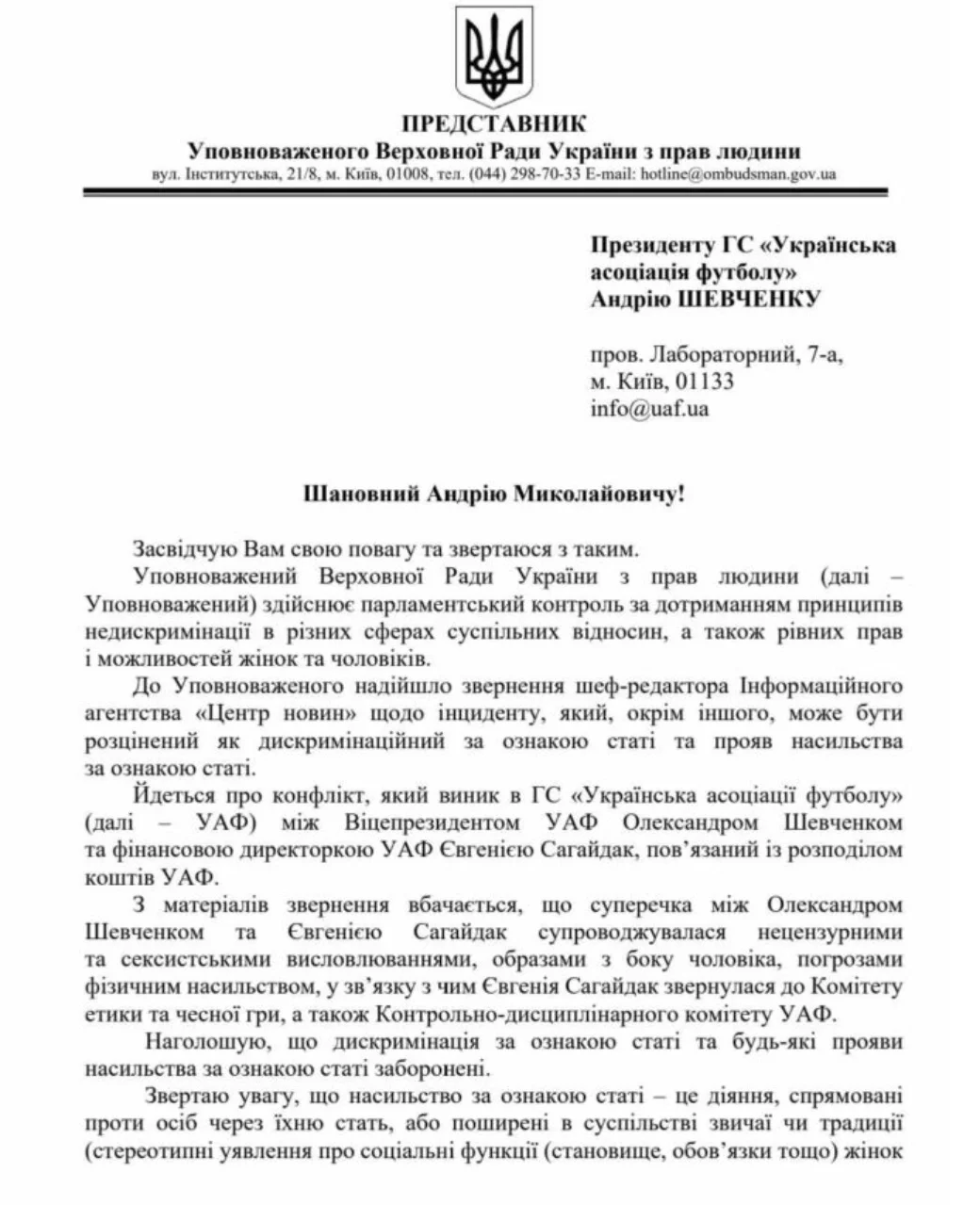 "Суперечка між Олександром Шевченком та Євгенією Сагайдак супроводжувалася нецензурними та сексистськими висловлюваннями, образами з боку чоловіка, погрозами фізичним насильством, у зв’язку з чим Євгенія Сагайдак звернулася до Комітету етики та чесної гри, а також Контрольно-дисциплінарного комітету УАФ. Наголошую, що дискримінація за ознакою статі та будь-які прояви насильства за ознакою статі заборонені", – йдеться у зверненні до Андрія Шевченка.