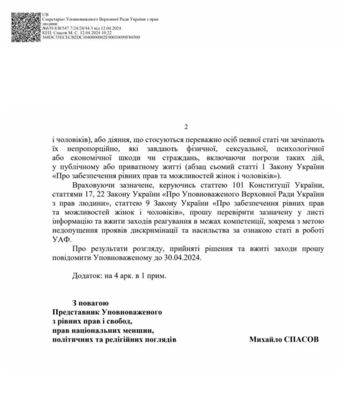 Також Уповноважений просить Андрія Шевченка відреагувати на конфлікт та закликав вжити усіх можливих заходів з метою недопущення проявів дискримінації та насильства за ознакою статі в роботі УАФ. "Насильство за ознакою статі – це діяння, які завдають фізичної, сексуальної, психологічної або економічної шкоди чи страждань, включаючи погрози таких дій, у публічному або приватному житті (абзац сьомий статті 1 Закону України "Про забезпечення рівних прав та можливостей жінок і чоловіків")”.