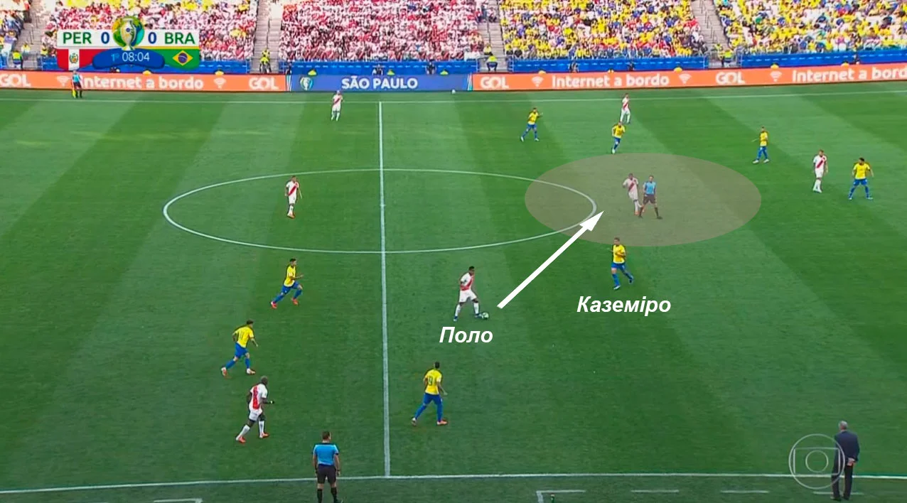 Просування м'яча через центральну зону виглядало доволі повільним і несистемним – якраз з цим пов'язана велика кількість обіграшів один-в-один. Поки перуанці трималися в центрі біль-менш продумано, якість трикутників в центрі була невисокою. Більше того: центрхави під пресингом іноді губилися, спускаючись з центру у подібні ситуації: