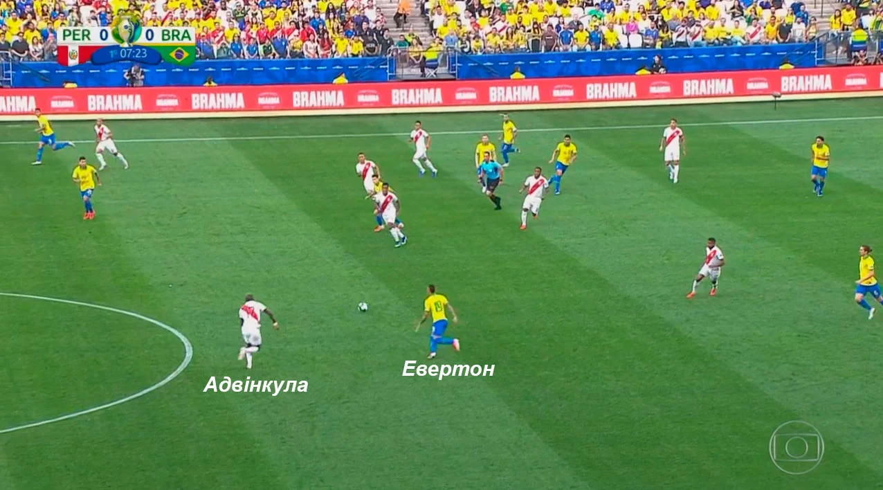 Артур сам змістився вниз до двох нападників Перу, загнавши себе у ситуацію 4-в-2 біля власих воріт.