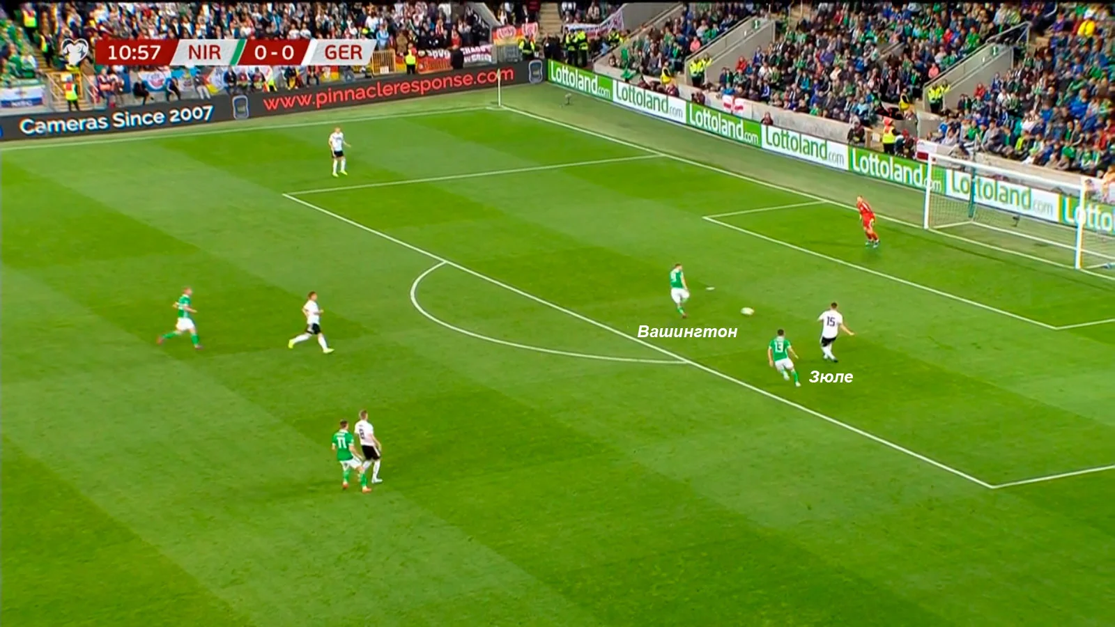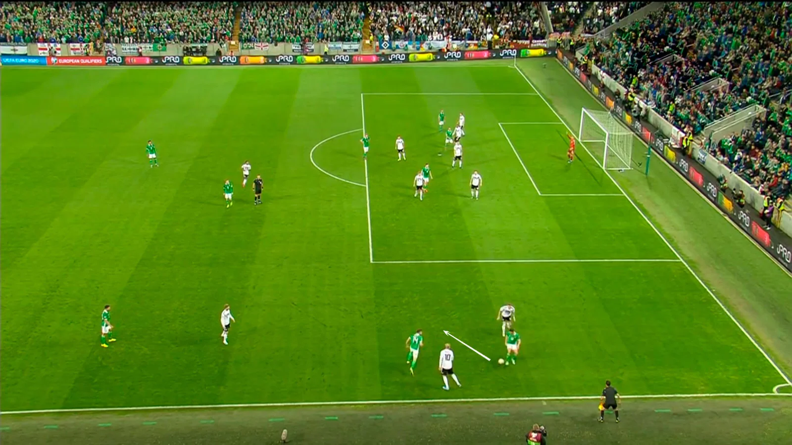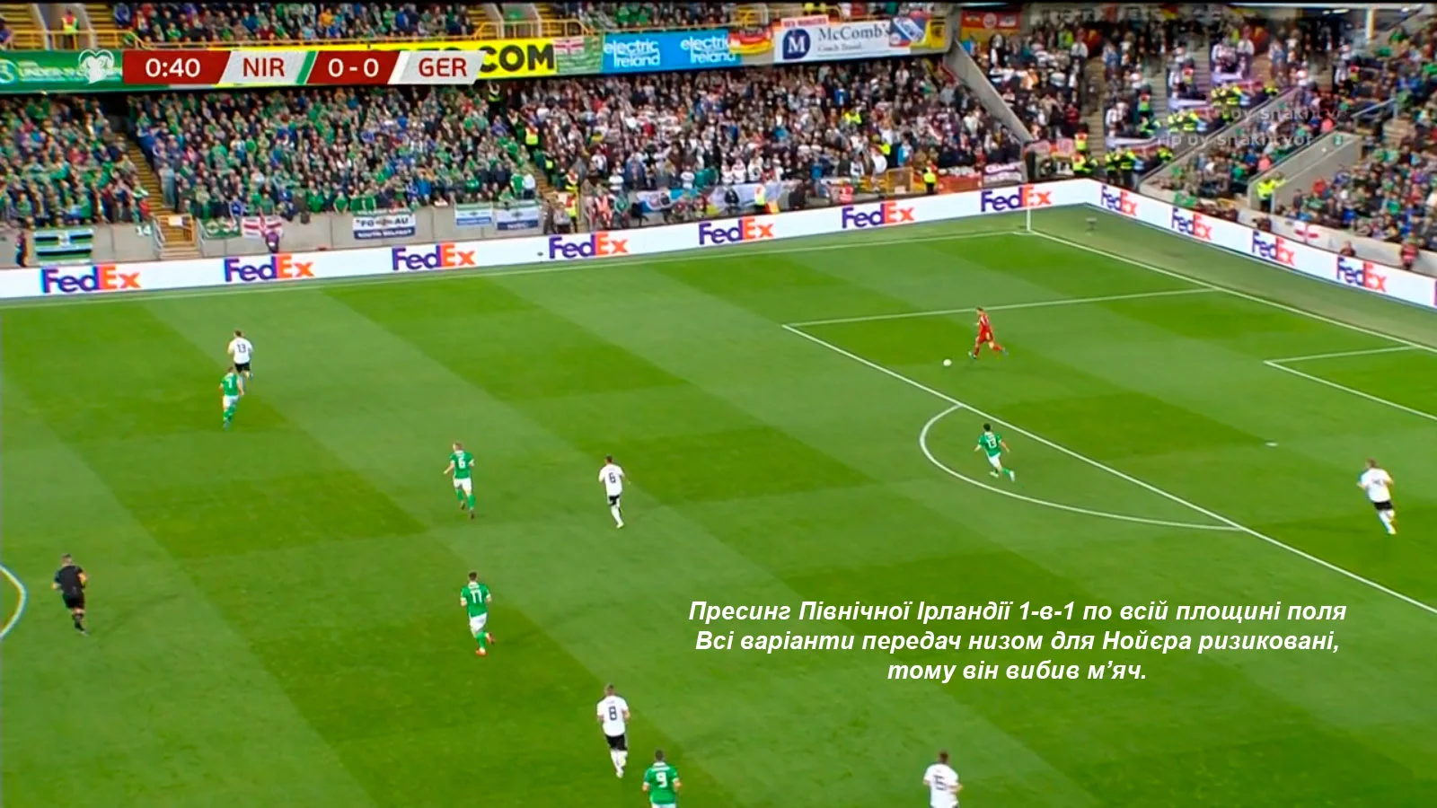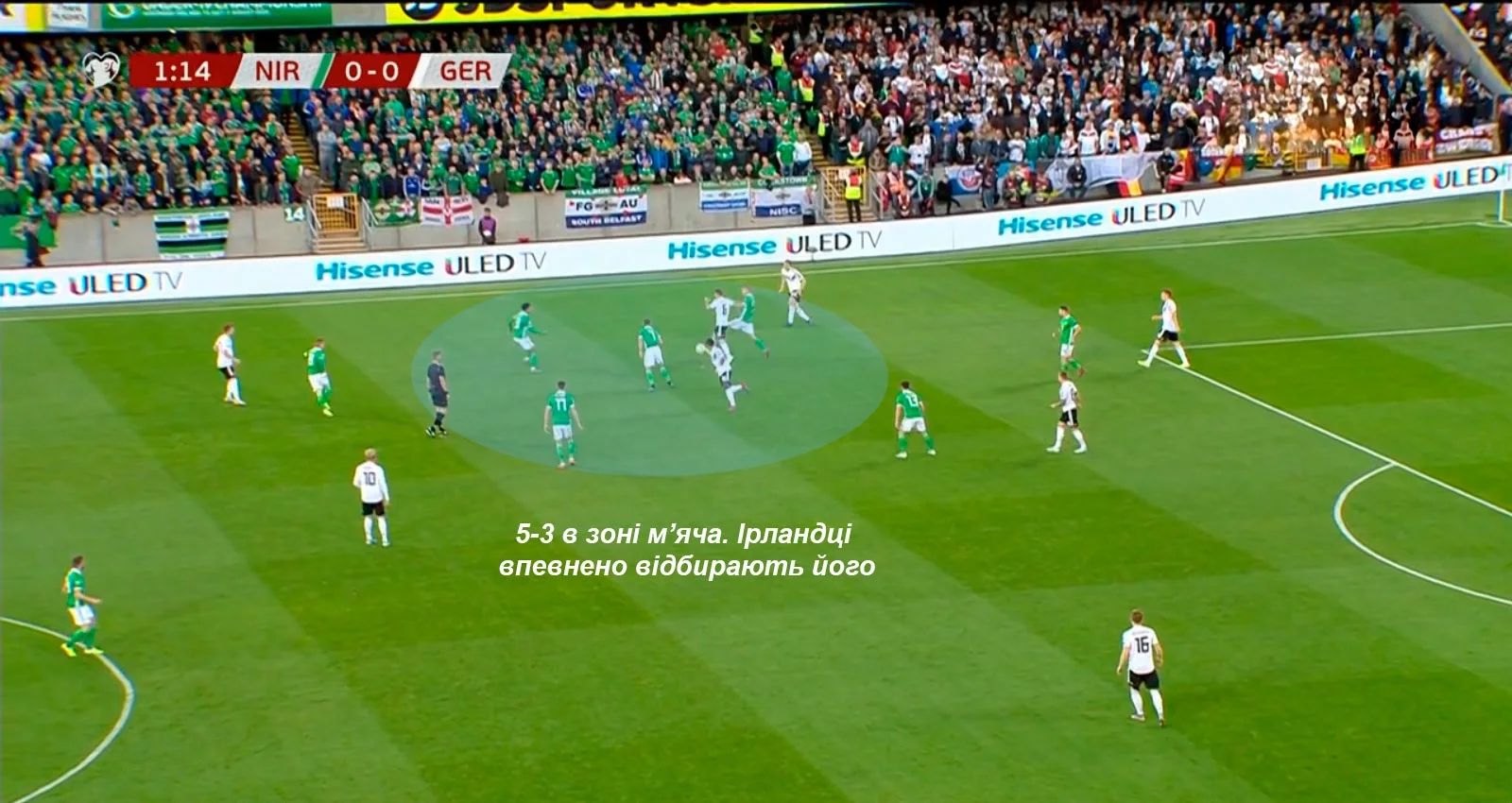 Для якісного тиску потрібно ще й створювати чисельні більшості у зоні м'яча. У Північної Ірландії проблем з цим не виникало. Німці у першому таймі регулярно потрапляли у подібні ситуації – якщо б проти них діяли не скромні ірландці, а голландці, це могло завершитись великими проблемами.