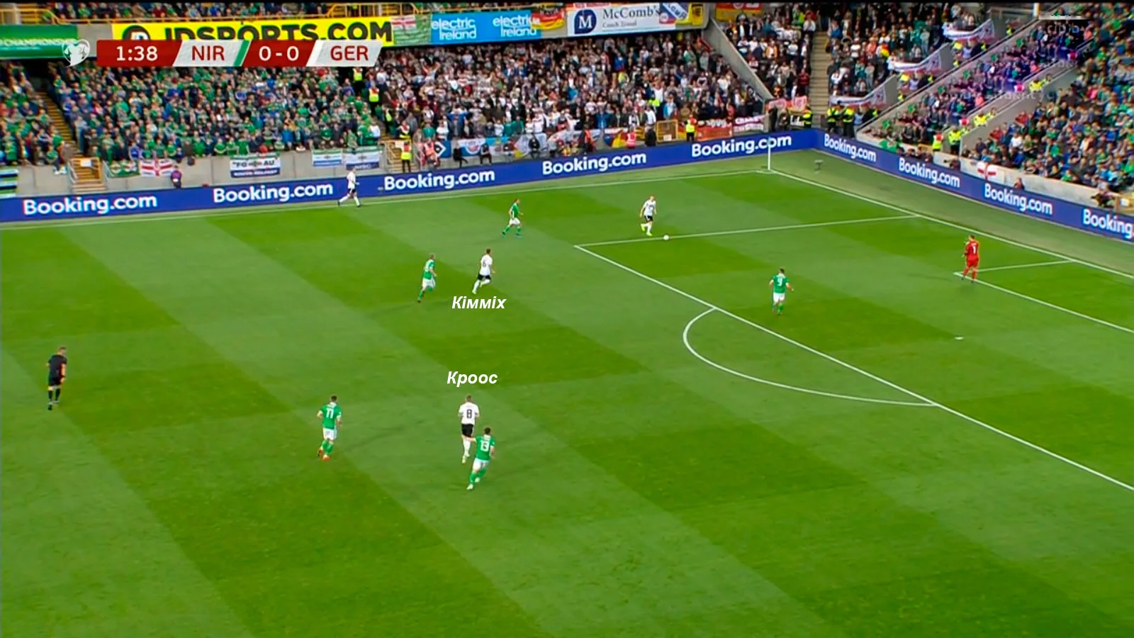 Для виходу з подібних ситуацій Кроос та Кімміх спускалися понижче, однак за ними неодмінно йшли опорники Північної Ірландії. Це був ризикований підхід, адже одна точна передача за спини опікунів центрхавів могла призвести до колапсу – та і взагалі пресинг 1-в-1 дуже чутливий до різноманітних переміщень. Втім, на старті зустрічі у "зелених" були сили, а от футболісти "Бундестім" раз за разом помилялися.
