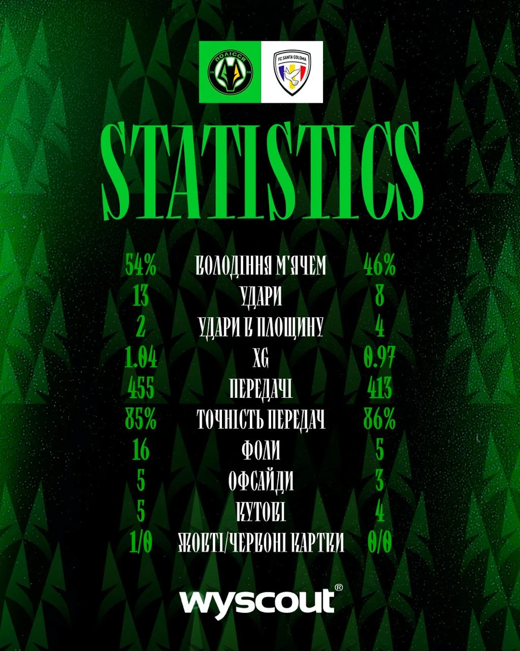 Як повідомляє статистичний портал Wyscout, житомиряни володіли м'ячем 54% часу, завдали 13 ударів проти 8 у суперника та мали вищий показник очікуваних голів – 1.04 xG проти 0.97. Також показовим є розрив у кількості передач: 455 у Полісся проти 413 в андоррців.