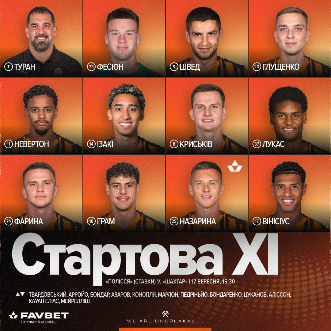 Стартовий склад Шахтаря: Фесюн, Швед, Глущенко, Невертон, Ізакі, Криськів, Лукас Ферейра, Фарина, Грам, Назарина, Вінісіус Тобіас