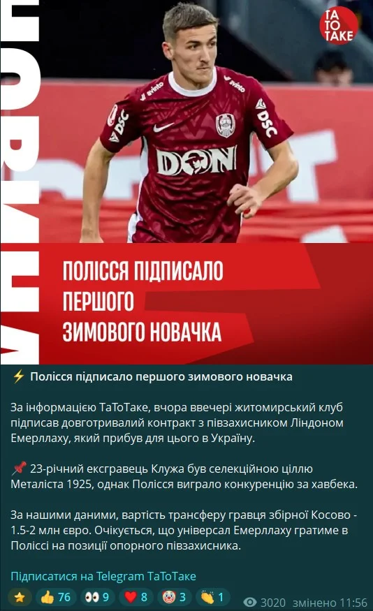 Полісся вже підписало довгостроковий контракт із косоваром Ліндоном Емерлаху, повідомляє ТаТоТаке.