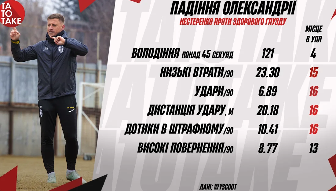 Олександрія намагалася працювати через контроль м'яча, любила комбінувати у білд-апі й декларувала агресивний стиль. На практиці ж усі ударні показники "жовто-чорних" виявились найгіршими в УПЛ. Як наслідок, колектив опинився у восьми очках від зони перехідних матчів – і змінив головного тренера. Замість Кирила Нестеренка повернувся Володимир Шаран.