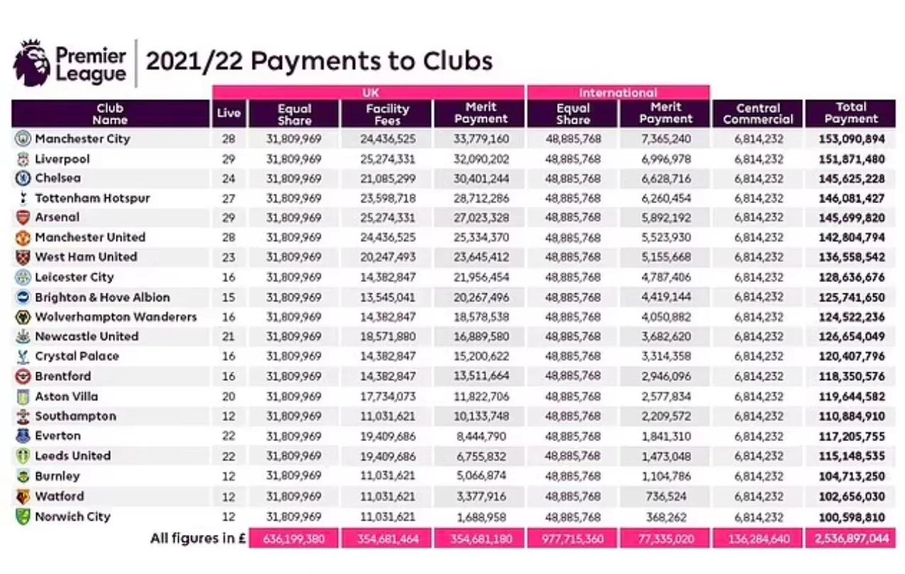 Усі без винятку учасники англійської Прем'єр-ліги отримали понад 100 мільйонів фунтів за виступи у кампанії 2021/22.