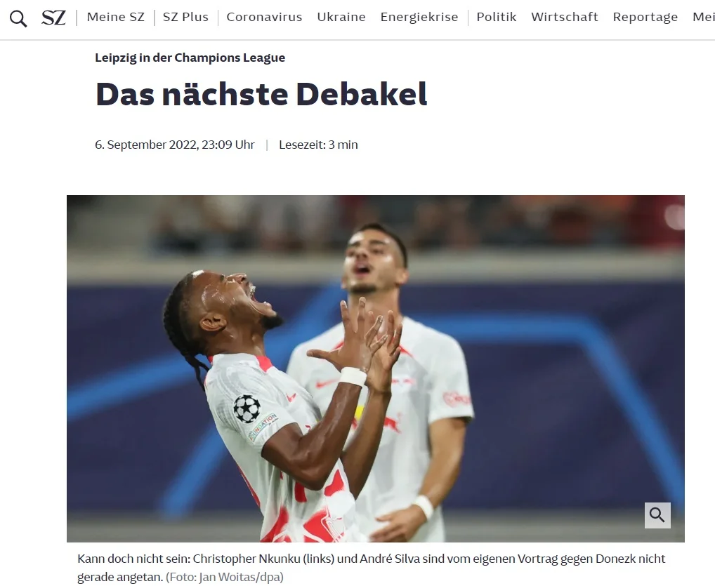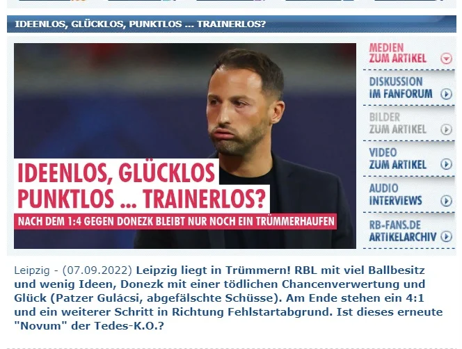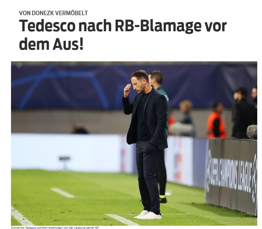 "Через три дні після розгрому у Франкфурті з рахунком 0:4 РБ Лейпциг також зробив дурницю в Лізі чемпіонів, зазнавши домашньої поразки від Шахтаря з рахунком 1:4. Доменіко Тедеско втрачає роботу після провалу на старті сезону. Тренер випробовує все проти донеччан. Він вперше об’єднує атакувальне тріо Вернер-Сілва-Нкунку, у захисті перемикається на четвірку, вперше випускає Діало у стартовому складі. Але нічого не допомагає. Через чверть години після старту матчу Лейпциг приймає холодний душ. Голкіпер Петер Гулачі фальшивить справа, фальшивить зліва – а потім абсолютно без потреби віддає м’яч Шведу, якому залишається лише пробити у порожні ворота.