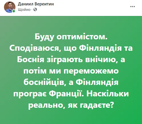 Данило Вереітін, редактор спортивного відділу Фокусу, зберігає оптимізм і вірить у диво. А що ще залишається робити? Від нашої збірної тепер мало що залежить.