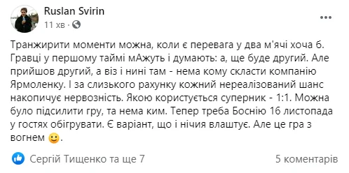 Спортивний тележурналіст Руслан Свірін підкреслює наше хронічне невміння вчасно добити пораненого суперника.