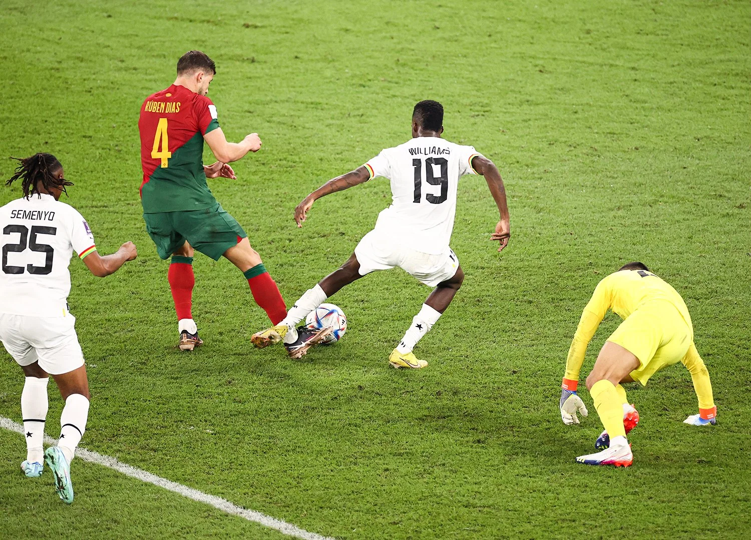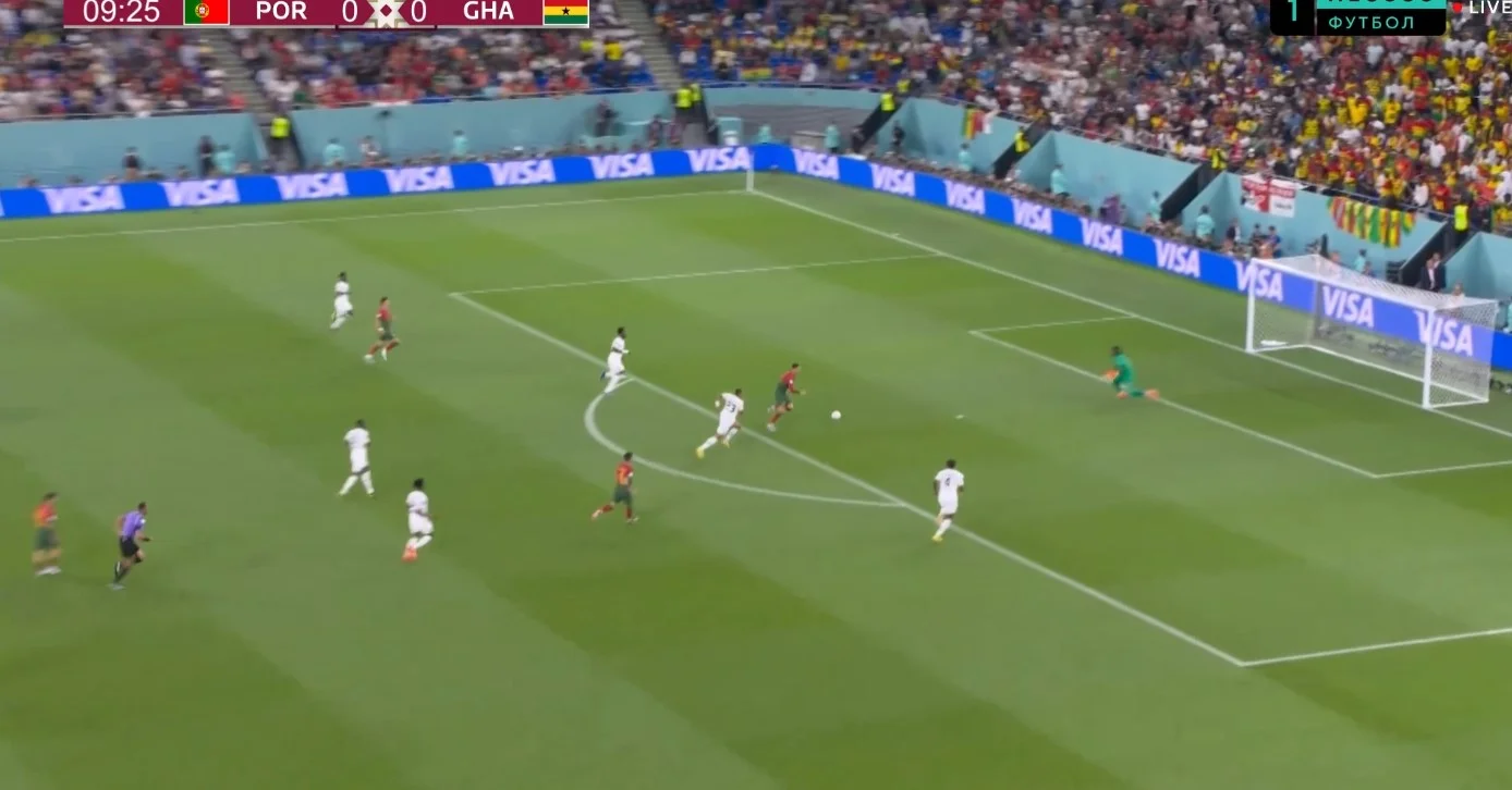 Ось так тишком-нишком не без допомоги суддівства і красиво намальованого пенальті КР7 забиває на 5 поспіль Мундіалі, стаючи першим, кому це вдалося! Тішилися португальці недовго. Пройшла легка комбінація лівим флангом, Кудус прострілив, Карвалью, який замінив травмованого Отавіо, курйозно пропустив собі поміж ніг, Андре Айю розстріляв з метра. Це було навіть легше, ніж з пенальті. Гана відігралася через 8 хвилин, а Португалія відновила статус-во за 5. Втрата на чужій половині, миттєве переведення за спини від Фернандеша. Фелікс показав Роналду, як це робиться. Минає ще секунд 130, і після чергової втрати Гани в центрі поля Бруну виводить сам на сам уже Леау. Тільки Роналду такі коменти не реалізовує? Кріштіану навіть з офсайду не може забити, вибігаючи на побачення з Аті-Зіджі.