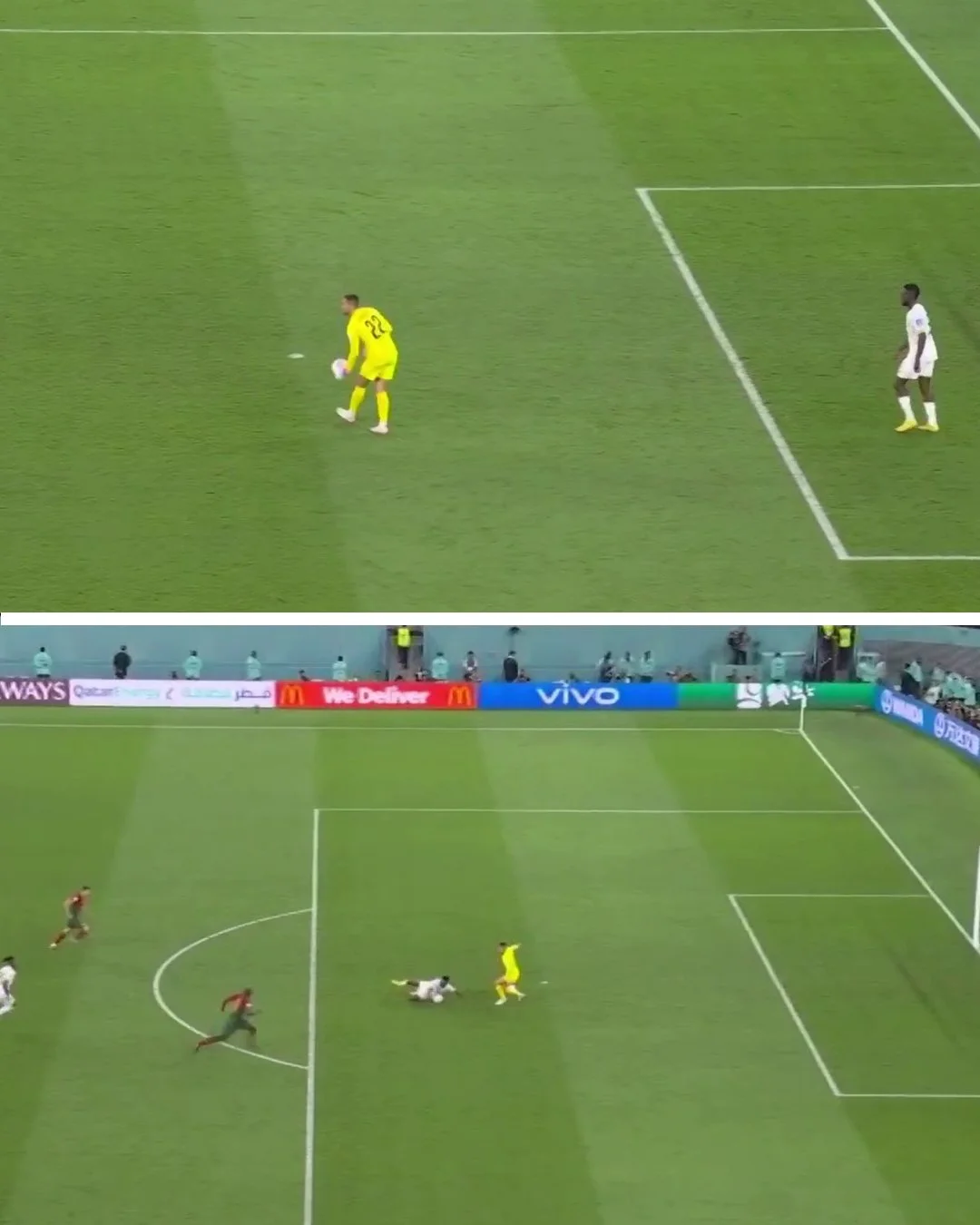 "Чорні зірки" і того не створили. Команда Отто Аддо відмовилася атакувати, навіть раз не пробивши у бік воріт за 45 хвилин. У господарів вирізняються креативною грою хіба що захисник дортмундської Борусії Геррейро і хавбек Отавіо – ще одне відкриття 1 туру Мундіалю з Порту після Еустакіо, який вчора феєрив за Канаду. Роналду ж надто багато бере на себе і навіть встигає блокувати простріли своїх же партнерів, настільки він прагне всю славу заграбастати. Прагнення щось всім довести заважає і самому Кріштіану, і команді Сантуша. В одному з епізодів таки забив, однак перед тим відштовхнув захисника руками. Фелікс, Бернарду Сілва і Бруну Фернандеш у тіні. За ударами до перерви 7:0, але якість моментів загалом не вражає: 0,62 xG на двох.