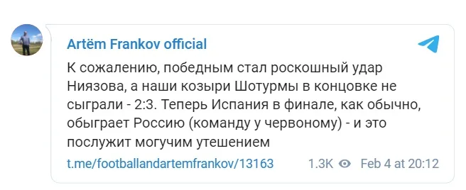 Головний редактор журналу "Футбол" Артем Франков шкодує, що козирі України наприкінці матчу не зіграли. Чемпіон для нього вже був відомий, хоча на той момент другий півфінал навіть не стартував.